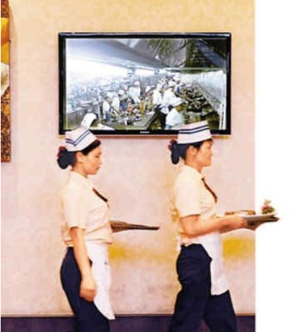兩名服務(wù)員端著剛剛出鍋的菜肴,走過實(shí)時(shí)顯示廚房?jī)?nèi)情景的監(jiān)控屏幕