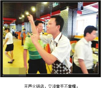 戴女士在微博看見(jiàn)朋友的介紹,特意帶著家人過(guò)來(lái),“在這里吃飯不僅覺(jué)得比平常的火鍋店安靜,心情也不一樣,心里多了一分對(duì)他們的尊敬。”戴女士說(shuō)跟他們交流并不是想象中的那么困難,“他們服務(wù)也特別周到和貼心,加茶都很主動(dòng),不用我們特別招呼。”
