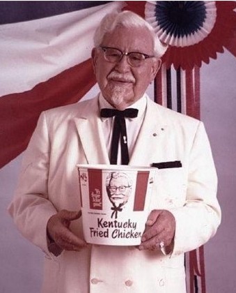 創(chuàng)始人桑德斯上校創(chuàng)辦肯德基時(shí)66歲,靠每月的$105社保生活。在肯德基獲得成功而接受電視臺(tái)采訪時(shí),他找出自己唯一一套干凈的、白色棕櫚裝,從此這一打扮成為他獨(dú)特的標(biāo)識(shí)造型,并以此注冊(cè)商標(biāo)。從此以后,人們便將這套西裝與肯德基聯(lián)想在一起;而他的這身白西裝,滿頭白發(fā),及山羊胡子也成為了全國(guó)性的象征。因?yàn)樯庾龅暮,肯德基州長(zhǎng)于1935年封他為肯德基上校,以表彰他對(duì)肯德基州餐飲的貢獻(xiàn)。