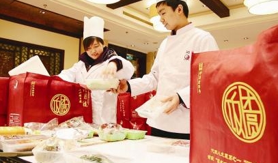 近日,蘇州某飯店服務(wù)員為“打包年夜飯”配菜。春節(jié)將至,蘇州一些“老字號(hào)”餐飲單位推出品種豐富的半成品“打包年夜飯”,讓市民在家中就能吃到美味可口的年夜飯。這樣既節(jié)儉又方便,受到消費(fèi)者青睞,銷售十分火爆。