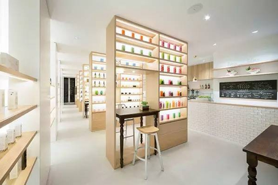 為了最大限度地突出產(chǎn)品本身,整個空間以白色為主色調,Nendo 設計團隊設計了很多原木材質的擱架單元,從地面架起至天花板,就像是圖書館里的書架似的。書架內置了白色透光性極強的發(fā)光裝置,映襯著放置在擱架上包裝色彩繽紛的產(chǎn)品,給人自然、溫暖的觀感。