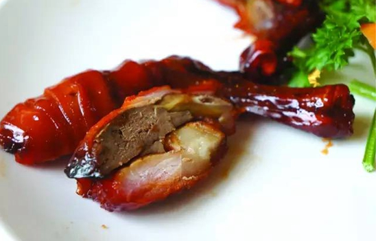 在清末民初的廣州,已經(jīng)有出現(xiàn)的“鴨腳包”,又稱“鴨扎”,它比“桂花扎”還要早流傳在廣式燒臘檔中。在那時(shí)候,無論是大小酒樓還是街邊燒臘鋪,都會(huì)見到鴨腳包的身影,但具體是誰首創(chuàng)的,就不得而知了。“鴨腳包”顧名思義,就是用鴨腳包食材再用鴨腸捆扎,放入爐中烤制。而鴨腳包著的食材,既有鴨肝或者雞肝,也有肥叉燒或者冰肉。
