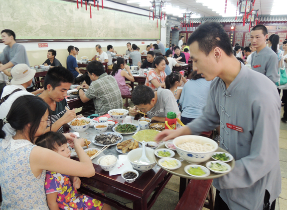 “來了,您哪,幾位,里邊請(qǐng)”、“小二,倒茶”這樣的高喊聲從人們一進(jìn)門就伴隨在耳邊,讓人一下子沉浸在老北京的市井文化中,隨之而來的便是穿對(duì)襟衣衫,蹬圓口黑布鞋、戴瓜皮帽、肩搭手巾把兒的小伙計(jì),帶著顧客來到大理石的八仙桌前,落座在紅漆實(shí)木的長(zhǎng)條凳上。觀賞著一幅長(zhǎng)約16米的畫作《清明上河圖》,聆聽著京韻大鼓,不知道還以為自己在排古裝戲!吃好喝好后,又會(huì)在門童和小二“送客、走好、您哪”的喊聲中愉快地離開。不過,與韻味十足的老北京氛圍不同的、能讓人回到現(xiàn)實(shí)的,是前臺(tái)的電腦軟件結(jié)賬系統(tǒng)和寬敞明亮的就餐大廳,向人們傳遞著現(xiàn)代科技與生活流行色交織在一起的飲食時(shí)尚。