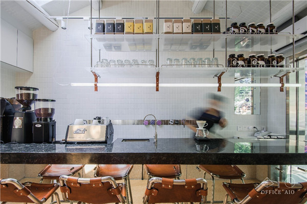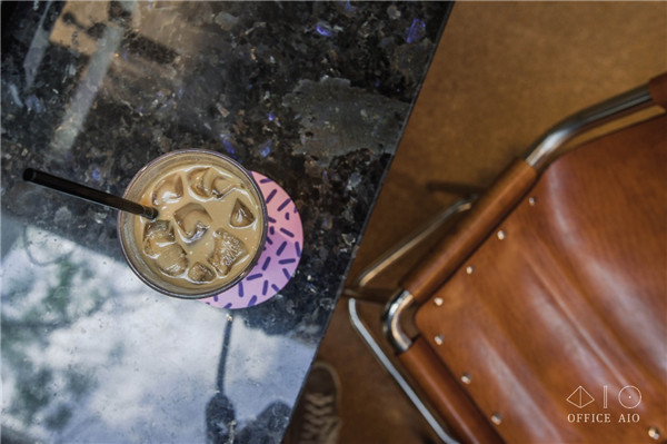 因?yàn)榭臻g面積有限,很容易被“一眼看透”,因此在一些地方增加細(xì)碎感的設(shè)計(jì)反而可以為空間提供更多“信息量”,讓顧客的目光被不同的細(xì)節(jié)吸引,增加空間的層次和趣味,比如杯墊和糖罐上就是色彩和排版上比較活潑的設(shè)計(jì),還有門(mén)把手、高腳凳、燈管懸吊處的天然皮革定制配件。
