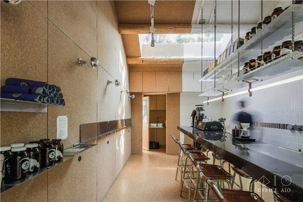 整個(gè)狹長(zhǎng)的空間里,規(guī)劃了幾條非常清晰的動(dòng)線,先是以吧臺(tái)為中心一分為二的整體空間,具有吸音效果的軟木墻背后是鄰居住家,而白色的咖啡師操作空間背后則是理發(fā)店,盡量做到鄰居之間互不影響。