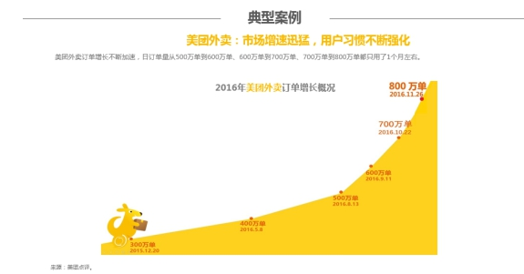 報告指出,外賣O2O市場增速迅猛,用戶習(xí)慣不斷強(qiáng)化。以美團(tuán)外賣為例,通過美團(tuán)外賣APP、美團(tuán)、大眾點評、手機(jī)QQ、微信等多元化的入口引流,截至今年9月,月活躍用戶數(shù)高達(dá)8,018萬人。目前,美團(tuán)外賣的日訂單量更是超過了800萬單,其中,日訂單量從500萬單到600萬單、600萬單到700萬單、700萬單到800萬單的增長都只用了1個月左右。