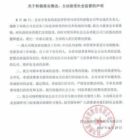 海底撈再發(fā)聲明:鍋我背、錯(cuò)我改、請廣大民眾監(jiān)督