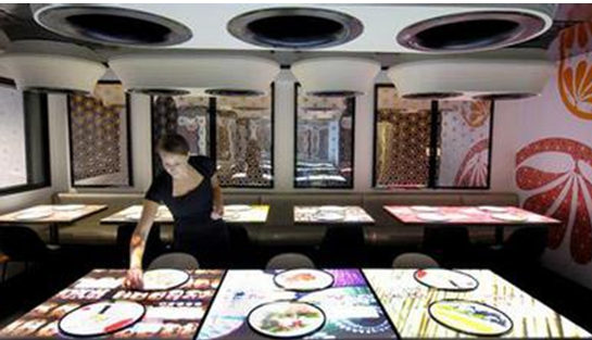 烏克蘭一家公司開發(fā)了一種叫做交互式餐廳的技術(shù),客人點(diǎn)餐變得完全自助。餐廳把菜品、飲料的照片、具體信息陳列在一個(gè)防水觸屏桌上,顧客只需要在電子菜單上下單就可以將信息網(wǎng)傳給廚房。不但可以節(jié)約服務(wù)員的本錢,還免掉了詢問菜肴情況的繁瑣程序,在這個(gè)桌面上可以輕松完成點(diǎn)餐的工作。