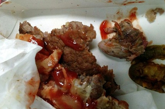 這名男子在墨西哥特萊內(nèi)潘特拉市的一家麥當(dāng)勞吃多汁漢堡,卻發(fā)現(xiàn)了讓人作嘔的東西。他拍照上傳到了網(wǎng)上,照片中能看到嚼碎的漢堡和一只支離破碎的頭。